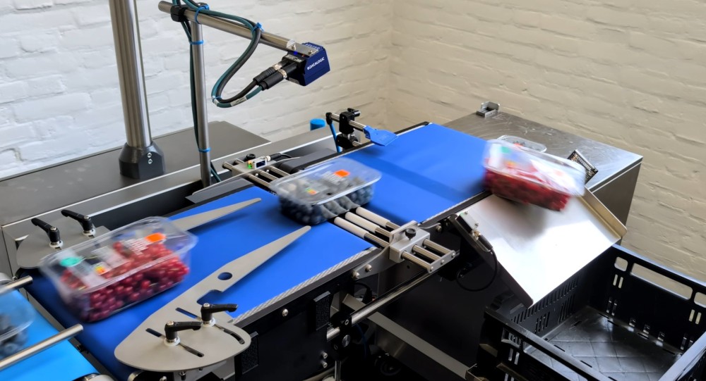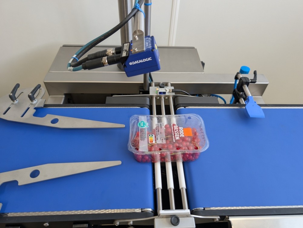 The system is designed for integration into a production line with a tray sealer. Changeover time is minimal. Capacity is approximately 150 products per minute, depending on the product and barcode. The belt speed is adjustable between 25 and 45 meters per minute. All trays should preferably be fed onto the conveyor belt* with the short side leading (SEL). Flow packs require further coordination and depend on the product type.
