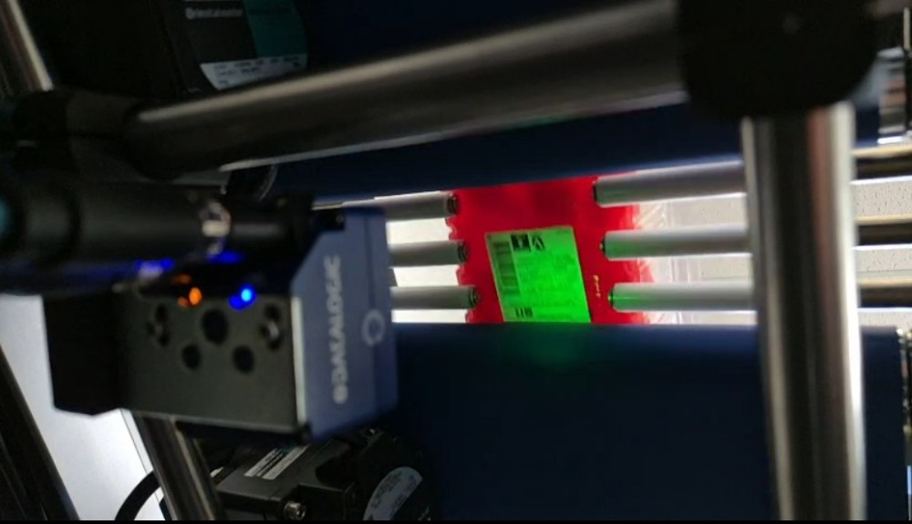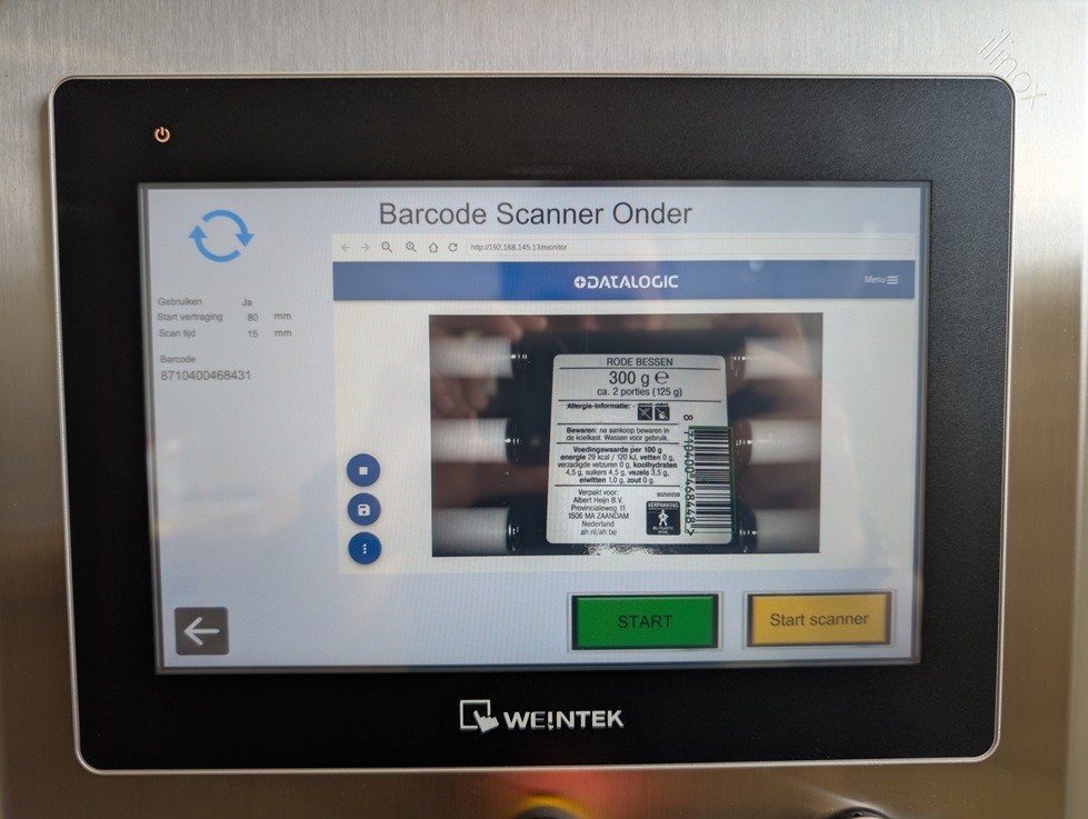 The system is equipped with two Datalogic barcode scanners that read both 1D and 2D codes, such as EAN, QR, and Datamatrix. A Siemens PLC with Weintek touchscreen makes operation and recipe changes easy.