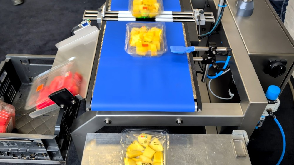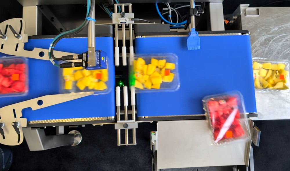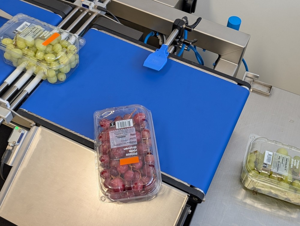 Rejected products are gently blown off the line by an air knife, without damaging the packaging.